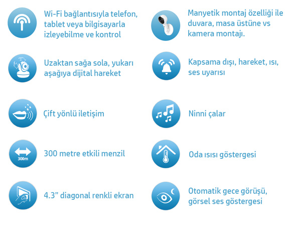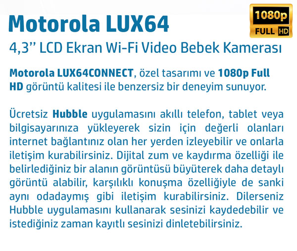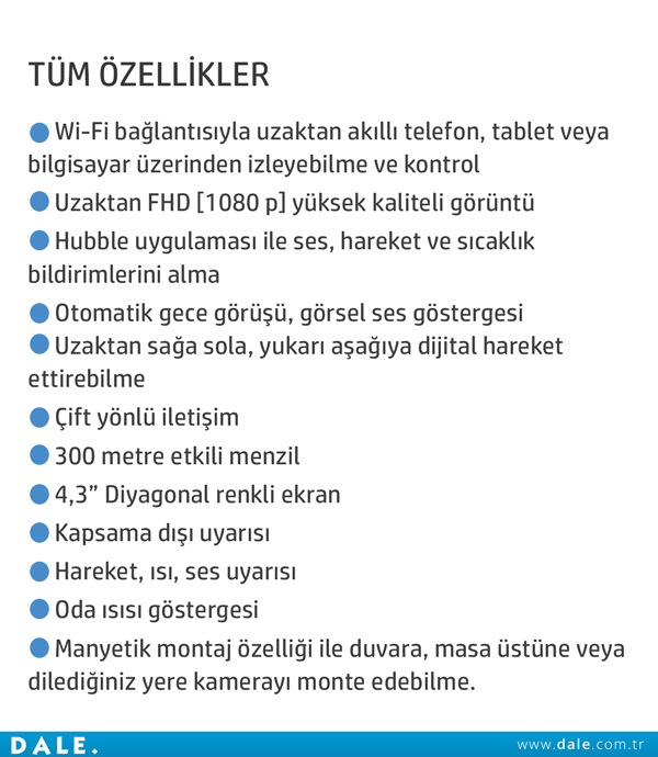Ücretsiz Hubble uygulamasını akıllı telefon, tablet veya bilgisayarınıza yükleyerek sizin için değerli olanları internet bağlantınız olan her yerden izleyebilir ve onlarla iletişim kurabilirsiniz. Dijital zum ve kaydırma özelliği ile belirlediğiniz bir alanın görüntüsü büyüterek daha detaylı görüntü alabilir, karşılıklı konuşma özelliğiyle de sanki aynı odadaymış gibi iletişim kurabilirsiniz. Dilerseniz Hubble uygulamasını kullanarak sesinizi kaydedebilir ve istediğiniz zaman kayıtlı sesinizi dinletebilirsiniz.